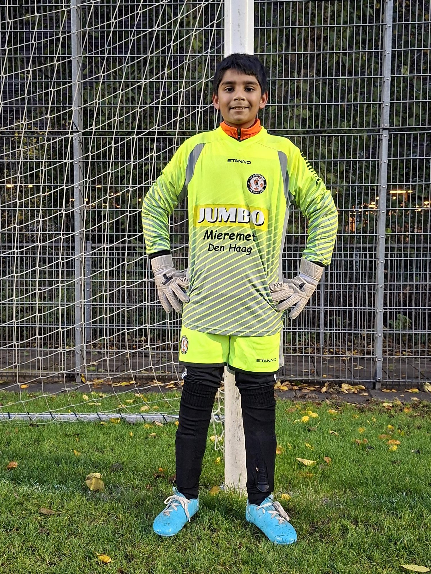Net toen de wedstrijd op het punt van beginnen stond, moest onze topkeeper Vishesh (zie foto) weg ivm familieomstandigheden. Gelukkig is alles in orde. Dat betekende dat Jason het doel ging verdedigen. Hij nam ruim de tijd om zijn handschoenen aan te doen. Jayden had namelijk zijn aanvoerdersband in de kleedkamer laten liggen. Hij zal komende week de aanvoerdersband aan zijn mouw vastnaaien.